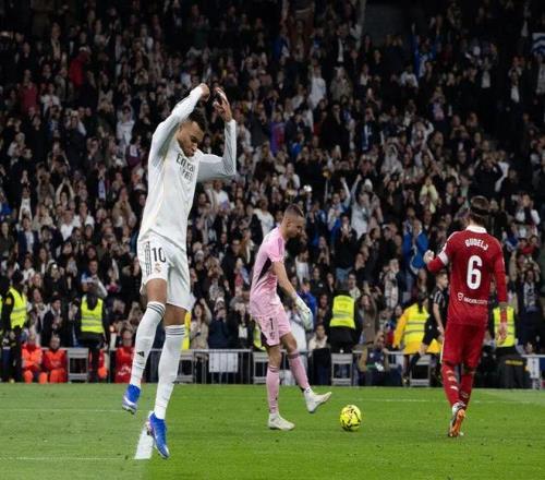 此役上半场第38分钟贝林厄姆为皇马打破僵局,下半场第86分钟姆巴佩主罚点球锁定胜局。进球后姆巴佩做出C罗招牌式庆祝动作,向偶像致敬。此球是2025年姆巴佩在皇马的第59球,追平C罗的皇马队史单年度进球纪录(2013年),这对姆巴佩而言是有里程碑意义的纪录。虽然皇马单年度进球纪录不会有任何奖项,但将永载皇马史册。